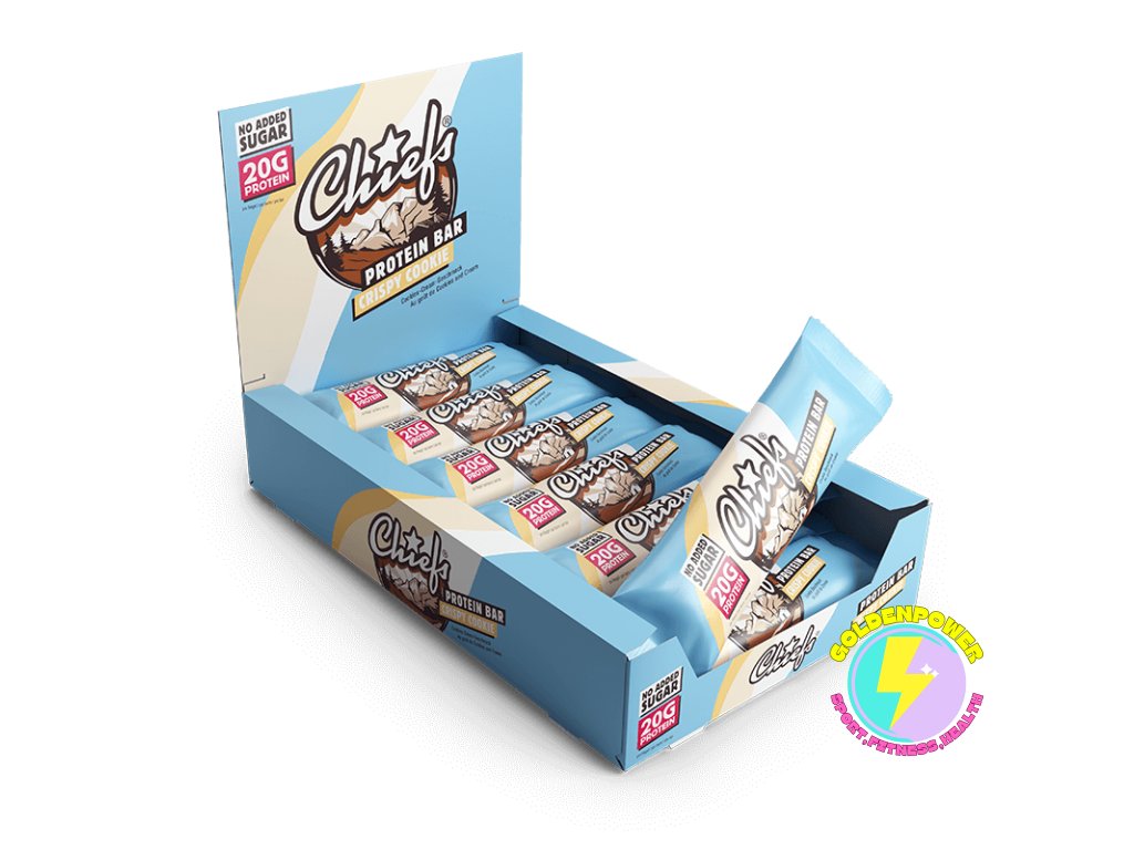 Výrobky Chiefs pocházející ze Švýcarska a vyznačují se švýcarskou kvalitou. Jsou křupavé na povrchu, měkké uvnitř, obalené v té nejlepší čokoládě - exploze chuťových pohárků je zaručena. To ale není všechno. Tato hříšně chutnající tyčinka obsahuje neuvěřitelných 20 gramů bílkovin a neobsahuje žádný přidaný cukr a dalších plno prospěšných látek.